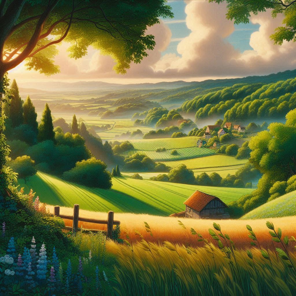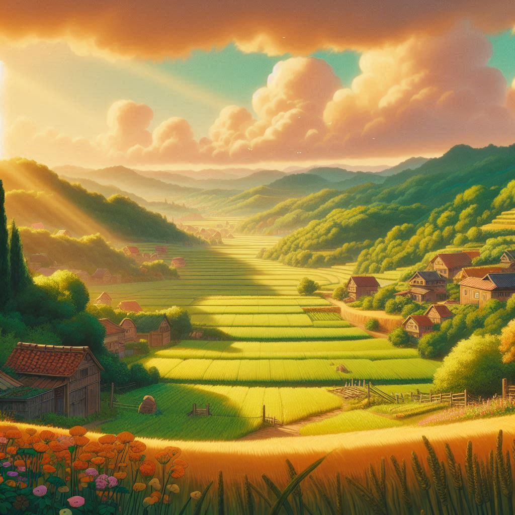 스튜디오 지브리 스타일의 아름다운 시골 풍경, 따뜻한 조명, 생동감 있는 색감, 푸른 들판, 수작업 느낌의 세밀한 배경, 부드러운 음영, 영화 같은 분위기